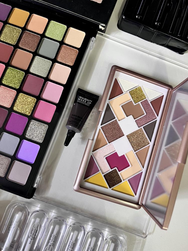 - ظلال جليتر + ظل ميني + بلاشر سائل لمسة إضافية من الإشراق.