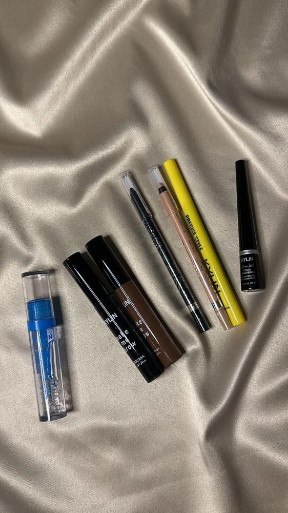 • كحل سائل ثابت وقلم تاتو حواجب وكحل بيج كريمي وكحل أسود كريمي: لإطلالة عيون جريئة وثابتة.