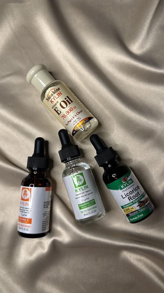 • سيروم وفيتامين C وقطرة عرق السوس: لتحسين إشراقة البشرة.